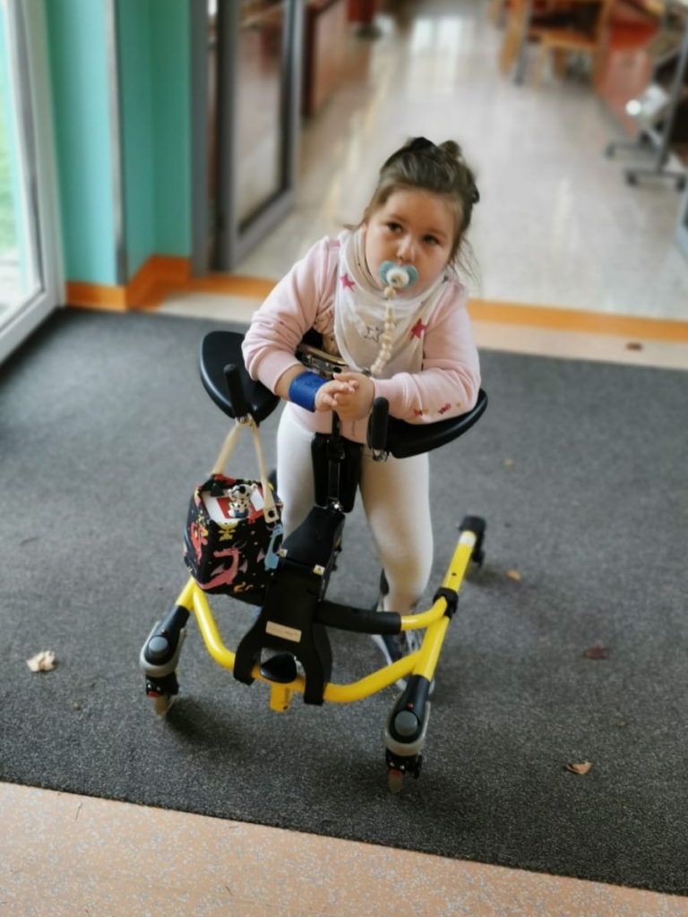 Der Mustang r82 ist ein Gehtrainer, der für eine gute Stabilität sorgt, da Marie viel Unterstützung beim Gehen benötigte. Durch ihre Spitzfüße war der Mustang r82 optimal für uns, da er Marie genau die Stabilität gab, die sie brauchte.