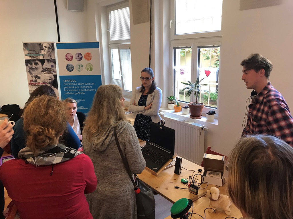 In der Mittagspause nutzten viele TeilnehmerInnen die Möglichkeit, sich am Stand von LIFEtool Prag bei Rostislav Jakoubek und seinem Team über die technischen Möglichkeiten zu informieren, Dinge wie PowerLink, Taster aber auch die Augensteuerung auszuprobieren und sich untereinander auszutauschen.