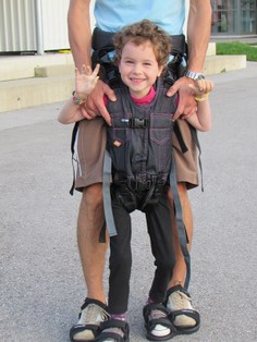Ein Beckengurt verbindet den Erwachsenen mit dem Kind, das mit dem Oberkörper in einem eigenen Gurt steckt. Beide schlüpfen in ein Paar Doppelsandalen – und fertig. Wenn Mama oder Papa gehen, geht das Kind mit bzw. muss das Kind mitgehen. Damit werde ich hoffentlich dieses Bewegungsmuster kennen lernen und automatisieren.