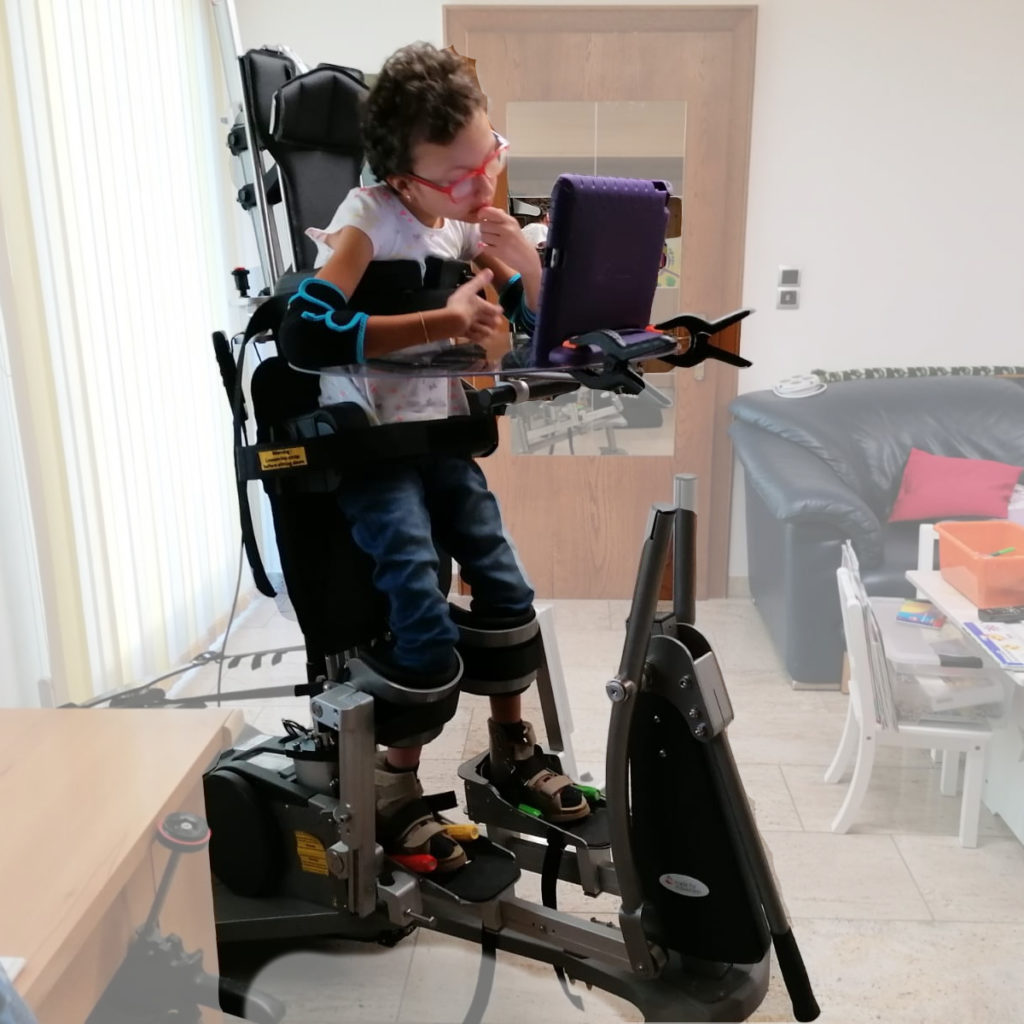 Unsere Tochter Katharina mag das Stehen gern, damit ist sie auf Augenhöhe mit ihren Geschwistern und trotz der Anstrengung des Stehens kann sie in dieser Postion viele Dinge tun und kann so ihren gesamten Organismus stärken.