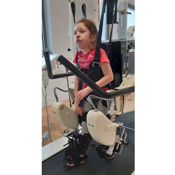 Annalena kann im Lokomat® die Bewegungsabläufe üben und automatisieren, das Training stärkt ihre Muskulatur und Knochen sowie ihren gesamten Körper, sie hat große Freude daran.
