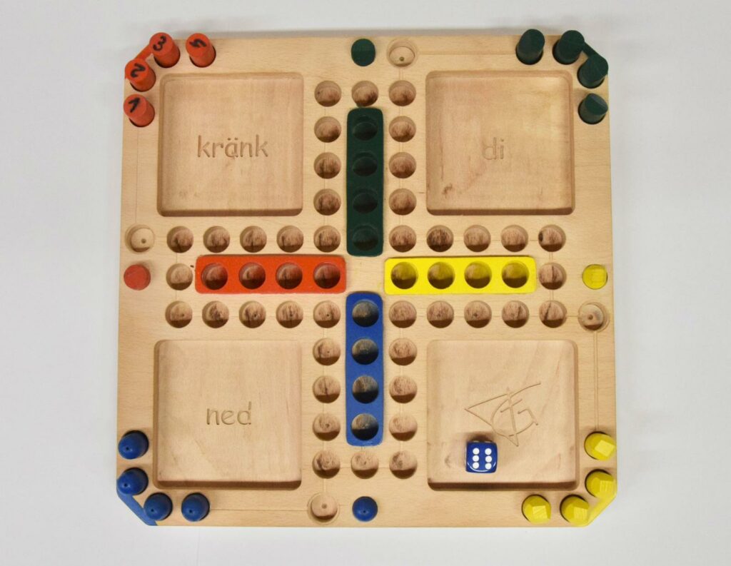 Ich, bin dann schnell, auf „Mensch ärgere dich nicht“ gekommen. Also habe ich ihm ein „Marcello ärgere dich nicht“ aus Holz gebaut. Die Figuren haben vier unterschiedliche Formen, rund, schräg, eckig und kugelig. Am Spielfeld gibt es Vertiefungen, wo die Figuren nicht umfallen können.