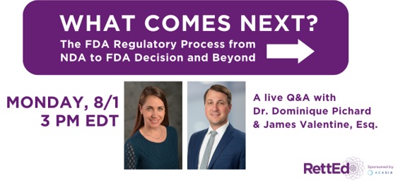 Dr. Dominique Pichard, Chief Science Officer der IRSF, selbst Mutter einer 15-jährigen Rett-Tochter, bat den FDA-Experten James Valentine, Esq. für ein Live-Webinar, um diese und viele weitere Fragen zu beantworten. Während des Webinars wurde das FDA-Zulassungsverfahren besprochen; es wurde darüber berichtet, was zwischen einer erfolgreichen klinischen Phase-3-Studie und einer FDA-Entscheidung über ein Medikament oder ein Therapeutikum passiert, und im Ansatz erklärt, was als Nächstes auf Trofinetide und somit auf die Rett-Gemeinschaft zukommen könnte.