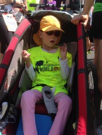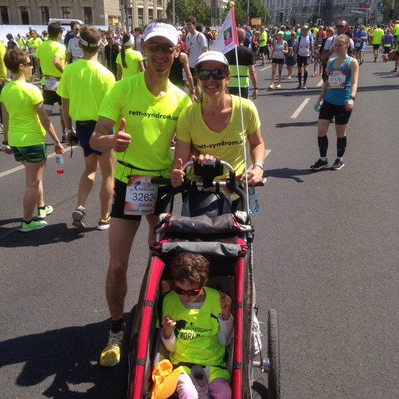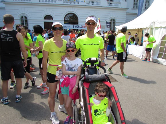Am 8. Mai 2016 machten wir (ich, Papa und meine Schwester Laura) Mama ein besonderes Muttertagsgeschenk. Wir starteten gemeinsam in Wien beim WINGS FOR LIFE WORLD RUN. Dabei hat sich Papa vorgenommen, mit mir noch einmal im Chariot (anstatt dem Rollstuhl – für mich bequemer und leichter zu schieben) eine längere Strecke zu laufen.Das Besondere an diesem Lauf ist, dass es sich dabei um einen Charitylauf zugunsten der Wings for Life Stiftung für die Rückenmarksforschung handelt und jeder solange läuft, bis man von einem Catcher Car eingeholt wird.Bereits am Vortag wurde alles zusammengepackt. In der Früh merkte ich, dass etwas Besonderes los war, sodass ich vor Aufregung nicht viel frühstücken wollte (das natürlich den Plan meiner Eltern etwas durch einander warf). Die 2 Stunden Autofahrt war recht lustig, wir hatten ja noch zusätzlich Begleiter mitgenommen, die ständig nach Pausen riefen. Geparkt wurde dann direkt vor dem Schloss Schönbrunn und unsere erste Challenge war die richtige U-Bahn zum Karlsplatz. In der Mittagshitze angekommen, es hatte in Wien an die 25 Grad, holten wir mal unsere Startnummern und wurden mit knallgelben Lauf T-Shirts ausgestattet.