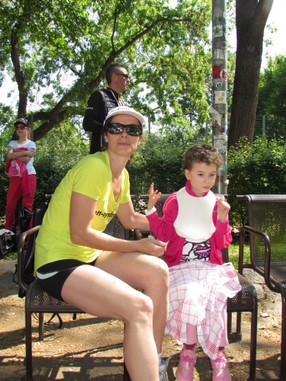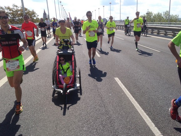 Papa war ziemlich schnell mit mir und musste sich 4 km lang den Weg durch die Menge suchen, was mit meinem Chariot nicht so leicht war, um auch keinen Läufer zu überfahren. Mama hängte sich hinter uns rein. Immer wieder wurde meine Sonnenbrille während dem Laufen gerichtet und die Zuschauer feuerten uns an. Mir gefiel diese Atmosphäre und ich konnte den Lauf juchzend genießen. Einige Läufer wollten sogar mit mir mitfahren bzw bewunderten Papa für seine Ausdauer.